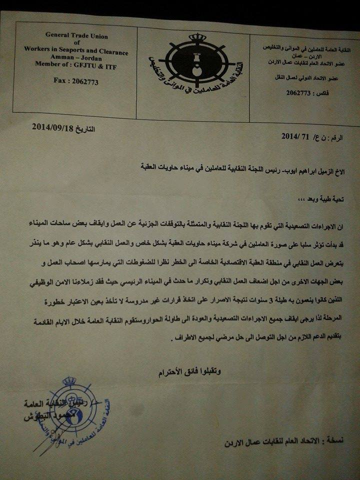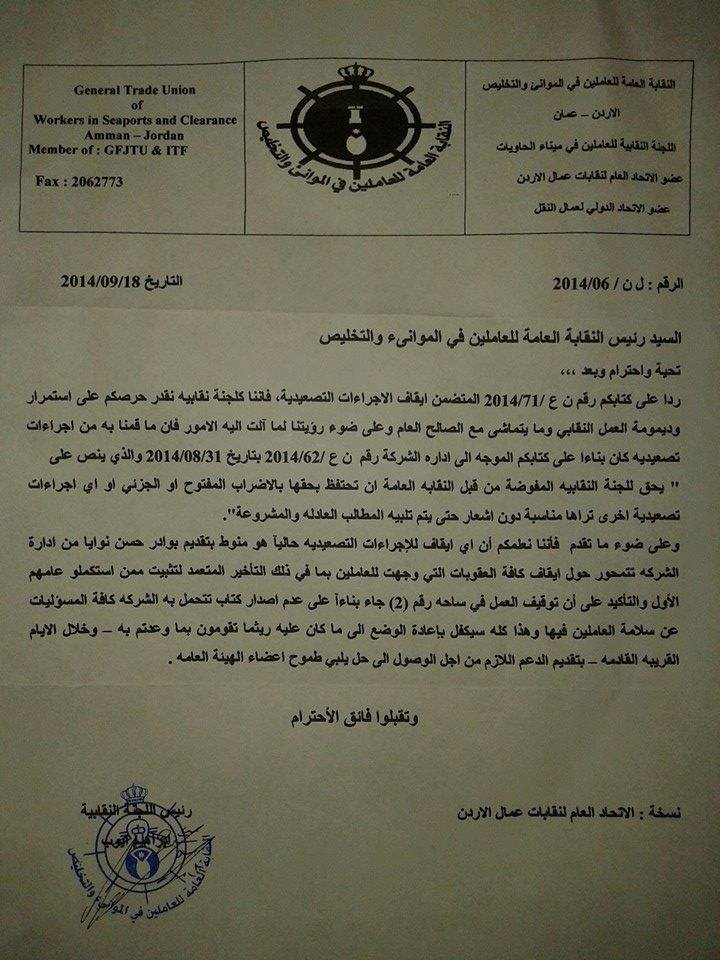 من جانبها، قالت النقابة العامة للعاملين في الموانئ والتخليص أن تدخلها جاء بعدما وصلت المفاوضات بين إدارة شركة ميناء حاويات العقبة، واللجنة النقابية اغلى طريق مسدود.
