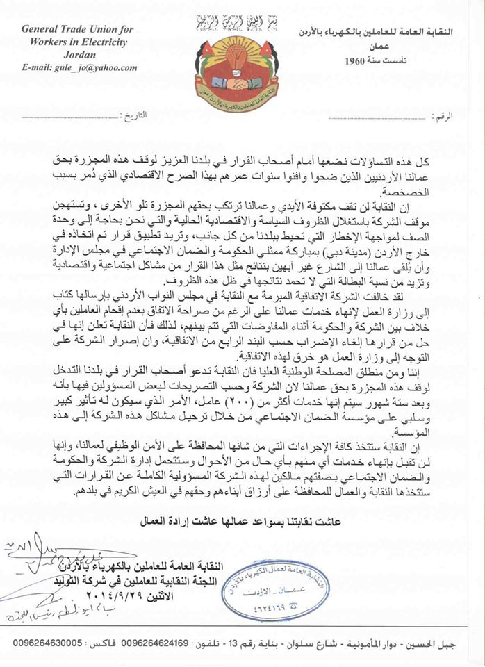 وأشار رئيس النقابة علي الحديد أنه رغم أرباح الشركة، إلا أنها بدأت بالاستغناء عن عمالها، الأمر الذي يدفع النقابة إلى اجراءات تصعيدية، تصل إلى الإضراب الكامل عن العمل، واعتبار الاتفاقية الموقعة مع الشركة لاغية حسب البند الرابع منها.